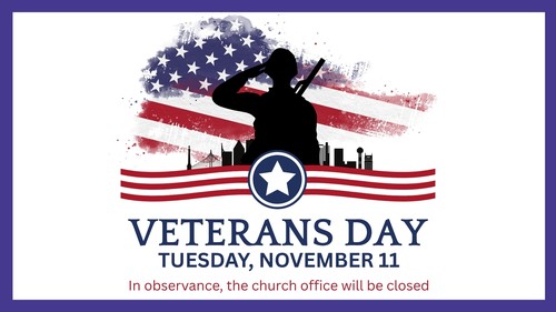 In honoring our veterans, the church office will be closed on Tuesday, November 11. We will resume our normal business hours of 9am-4:30pm on Wednesday.