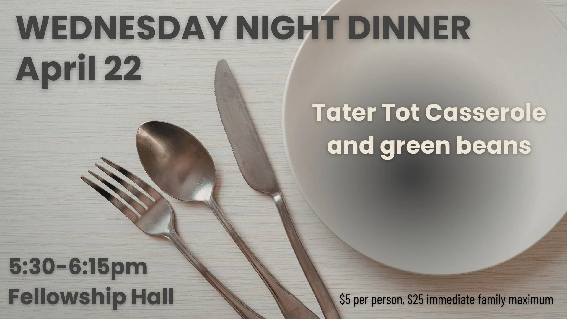 The menu is tater tot casserole and green beans. Dinners are $5 per person, with an immediate family maximum of $25. Dinner starts at 5:30pm. Hope to see you there!