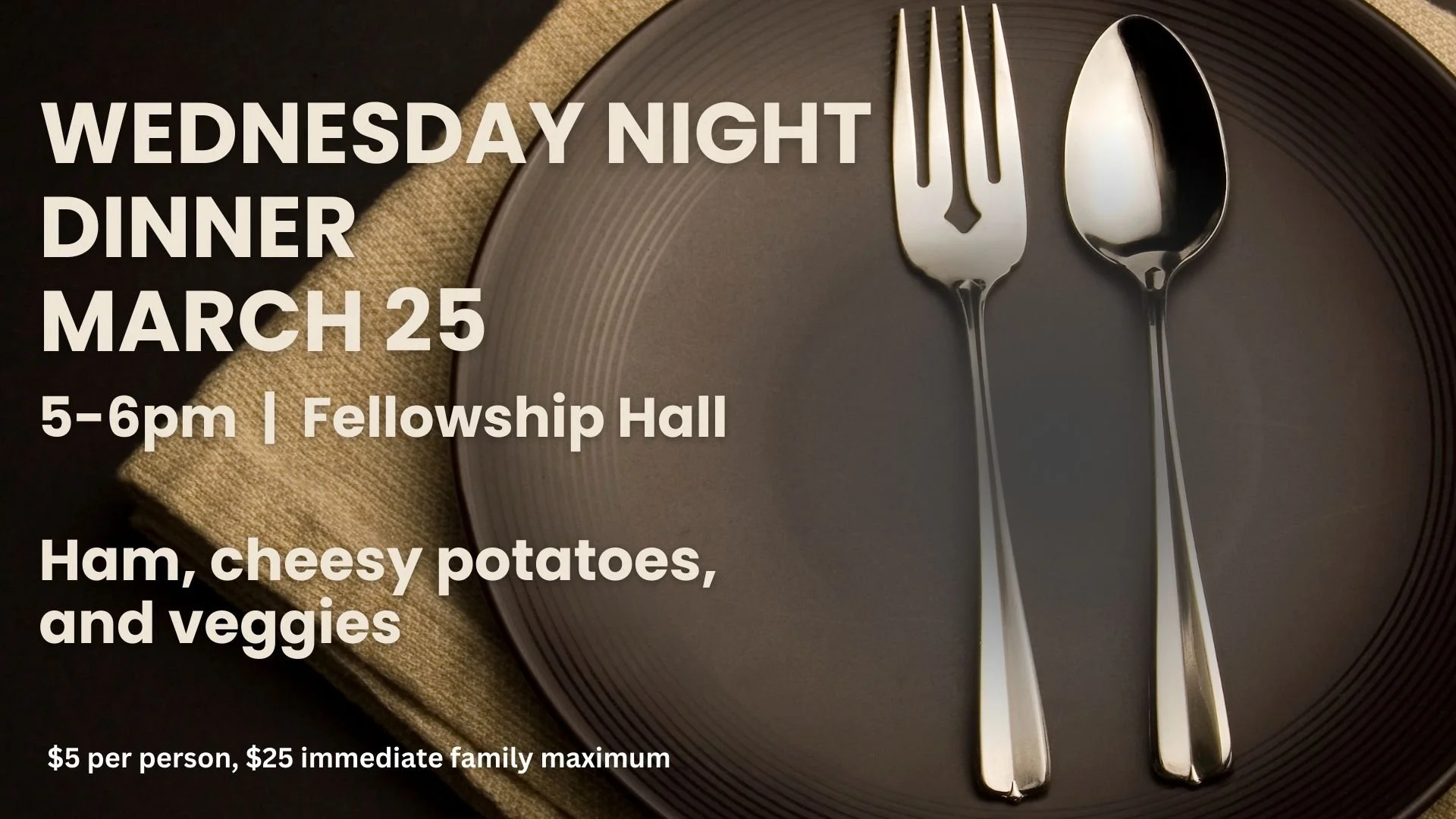 This week’s menu is ham, cheesy potatoes and veggies. Dinners are $5 per person, with an immediate family maximum of $25. Hope to see you there!