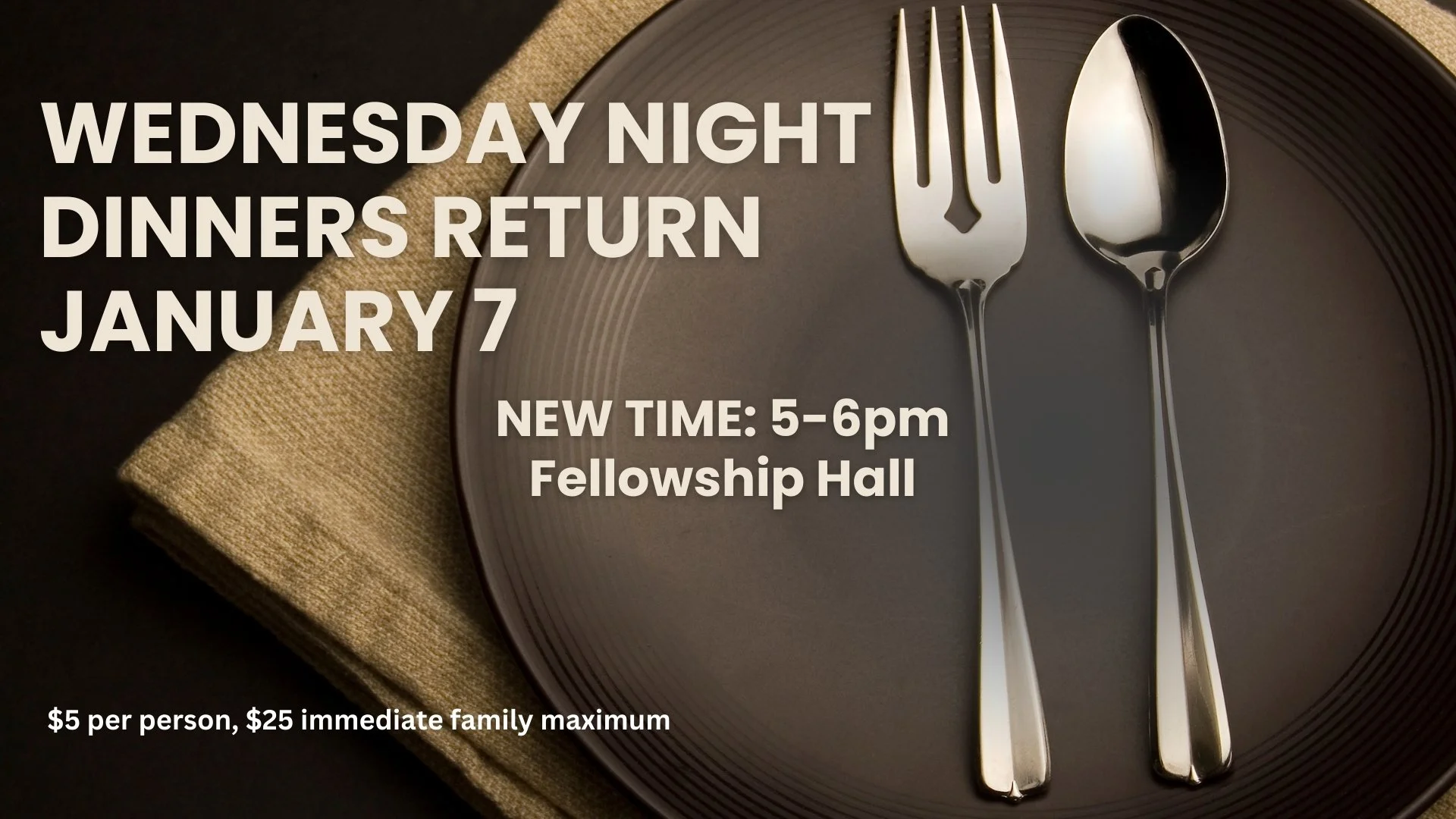 Come enjoy the return of our Wednesday night dinner program. We will meet in the Fellowship Hall from 5-6pm, enjoying a delicious meal and friendly conversation together. The cost is just $5 per person or a maximum of $25 for immediate family members.
