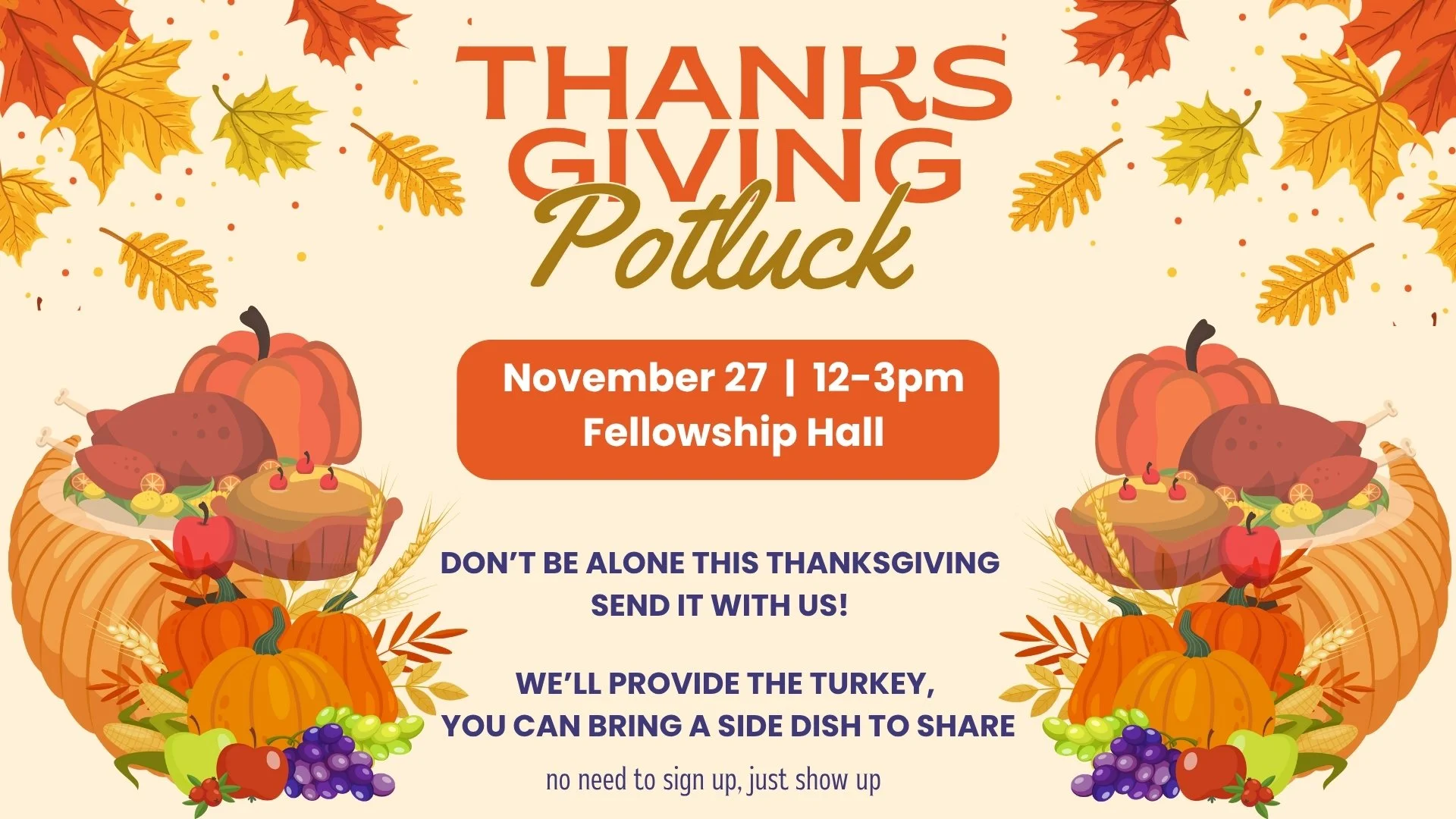 If your family is far away or your friends already have plans, you don’t have to spend Thanksgiving alone. Join us for a welcoming Thanksgiving Day Potluck! We’ll provide the turkey, and we ask that you bring your favorite side dish or dessert to share. Doors open at 12 noon, and we’ll serve the meal at 1pm. No registration needed, just come and celebrate with us!