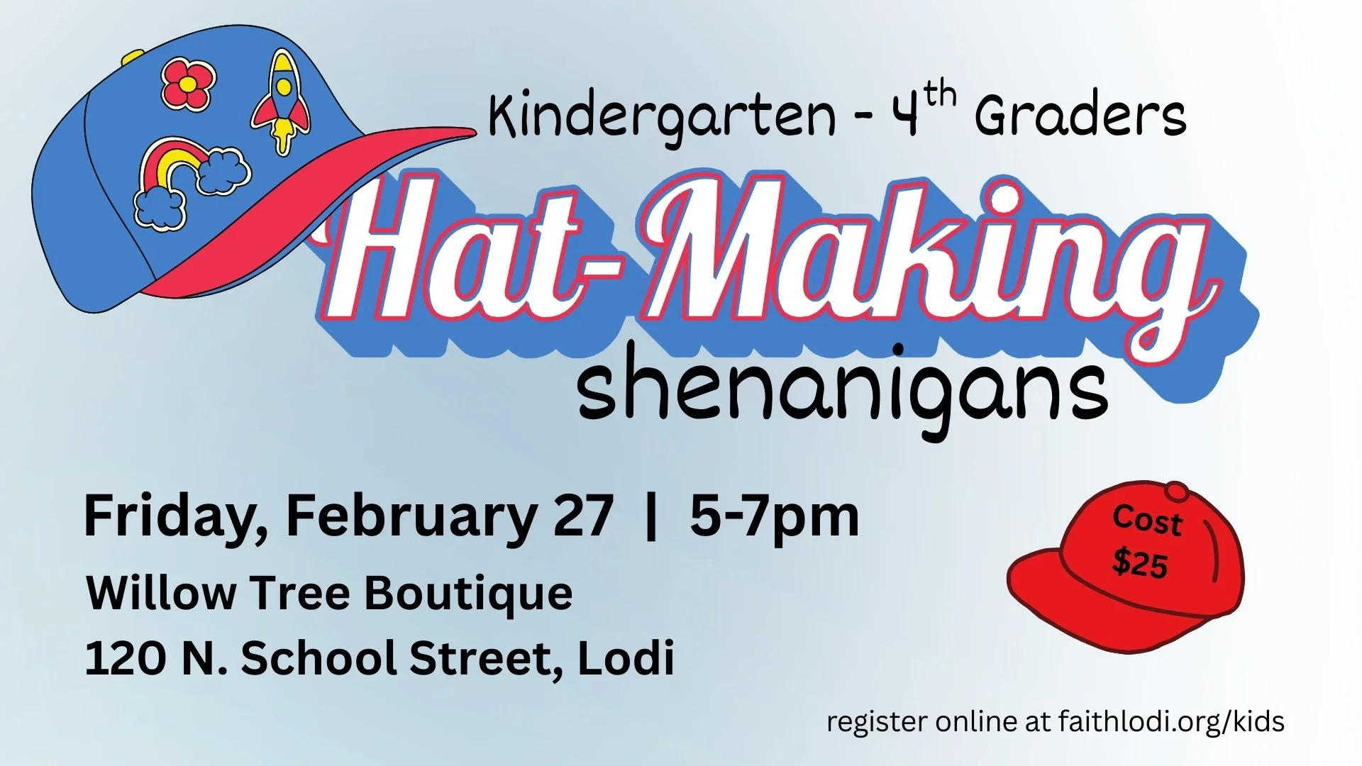 Let your child's creativity shine at our children's hat-making event! Kids Kindergarten to 4th grade will design their own custom hats with fun decorations in a welcoming boutique atmosphere. $25 payment will include a hat and two patches of your choice. Additional patches available for purchase. The cost is $25 per child, please sign up by February 27 and we’ll count you in.