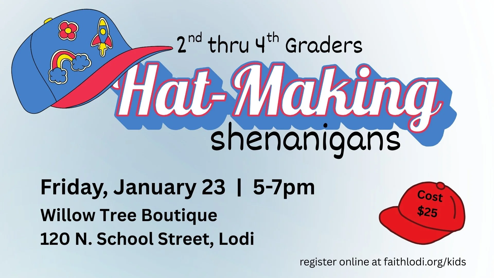 Let your child's creativity shine at our Children's Hat-Making event! Kids 2nd thru 4th grade will design their own custom hats with fun decorations in a welcoming boutique atmosphere. The cost is $25 per child and includes a hat and two patches of their choice. Additional patches available for purchase.