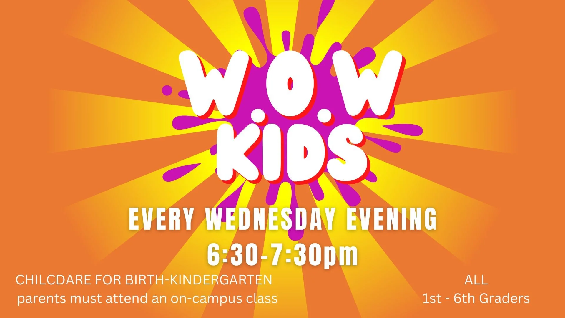 WOW Kids is for children 1st thru 6th grade. It is an action packed evening focused on fun, songs and stories from the Bible.