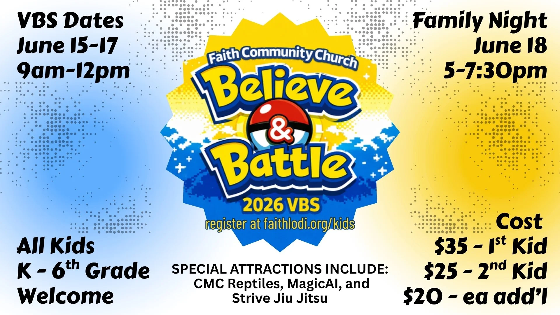 Then, on Thursday evening, June 18, from 5-7:30, parents plan to join us for a fun FAMILY NIGHT. We’ll have water slides, games, food, and a live Bible-themed Pokémon Go experience.